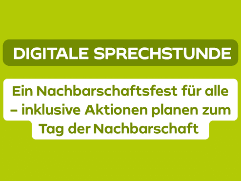 Dann melde dich für eine unserer digitalen Sprechstunden „Ein Nachbarschaftsfest für alle – inklusive Aktionen planen zum Tag der Nachbarschaft“ an. Gemeinsam mit der Aktion Mensch zeigen wir praxisnah, worauf du bei der Organisation deiner Aktion achten kannst, damit sie möglichst für alle zugänglich ist. Dabei ist es ganz egal, ob das Thema ganz neu für dich ist oder du bereits konkrete Fragen und Ideen mitbringst: In unserer Sprechstunde gibt es Gelegenheit, neues Wissen zu sammeln, Fragen zu stellen und praktische Tipps zu erhalten.
