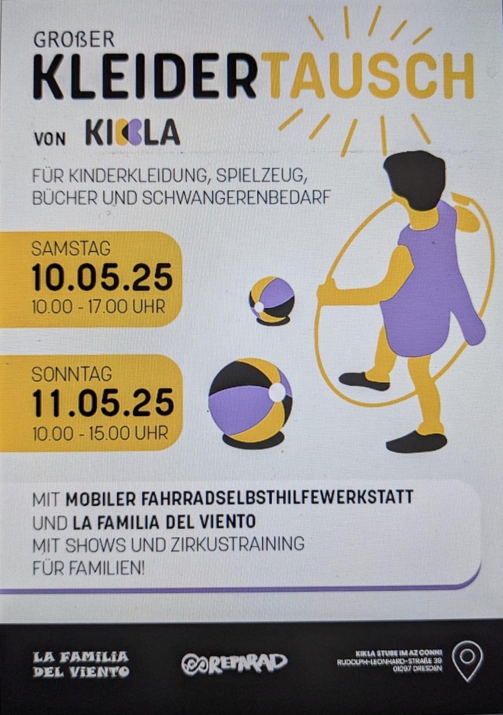 Am Samstag und Sonntag präsentiert euch euer ehrenamtliches Nachbarschaftsprojekt: „die Kikla-Stube“ alles rund um das Thema Sommer, Sonne und Sandalen! Bringt mit was ihr für euer Kind nicht mehr braucht und nehmt alles mit für die warme Saison. Nur bringen oder nur mitnehmen geht natürlich auch. Während ihr euer Kind kostenlos & nachhaltig einkleidet und in den Büchern, Spielen, Badewannen, Töpfchen und Bettchen stöbert, versorgt euch auf dem Hof die FAMILIA DEL VIENTO mit Zirkustrainings & spektakulären Shows und die Selbsthilfewerkstatt RepaRad nimmt euer Kinderfahrrad unter die Lupe. Fürs leibliche Wohl wird gesorgt sein.