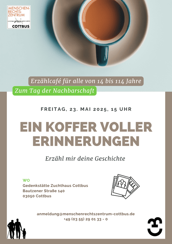 Ein Koffer voller Erinnerungen: Erzähl mir deine Geschichte. "80 Jahre sind seit dem Ende des Zweiten Weltkrieges vergangen, 35 Jahre seit der Wiedervereinigung von DDR und Bundesrepublik." Wie erging es den Menschen damals? Was beschäftigt sie heute? Welche Personen, Ereignisse und Geschichten sind es, die uns im Leben besonders berühren - die wir fürchten, die uns lächeln, die uns hoffen lassen? Gemeinsam mit dem Beauftragten für die Belange der Menschen mit Behinderungen und zur besonderen Vertretung der Seniorinnen und Senioren der Stadt Cottbus/Chóśebuz lädt das Menschenrechtszentrum Cottbus e. V. Interessierte zwischen 14 und 114 Jahren zum Erzählcafé ein. Lasst uns bei Kaffee, Snacks und Limonade ins Gespräch kommen und gemeinsam unseren Koffer der Erinnerungen füllen. Wer mag, kann gern ein Foto oder Erinnerungsstück mitbringen, das eine besondere Bedeutung hat. Jede/r darf selbst entscheiden, ob und welche Erinnerungen geteilt werden.