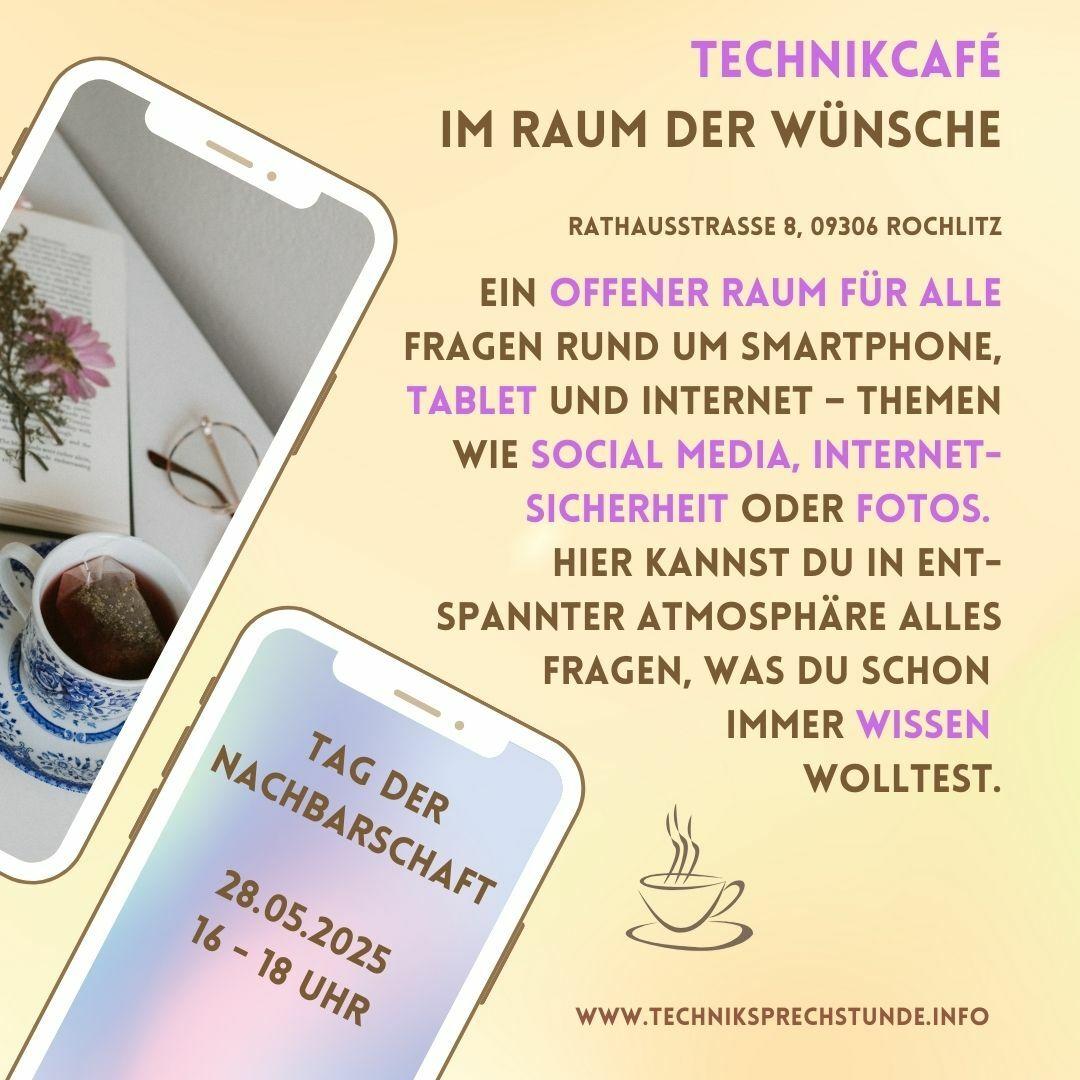 Wir laden euch herzlich ein im Raum der Wünsche zum Technikcafé in entspannter Atmosphäre bei Kaffee und Kuchen mit uns zusammen technische Fragen zu diskutieren. Hier bekommt ihr Hilfe bei Themen rund um Smartphone, Tablet, Internet, Social Media, KI und vielem mehr! Der Raum ist offen für alle und für alle Arten von Fragen, kommt einfach vorbei! Wir sind am 28.05.25 von 16 bis 18 Uhr im Technikcafé für euch da.