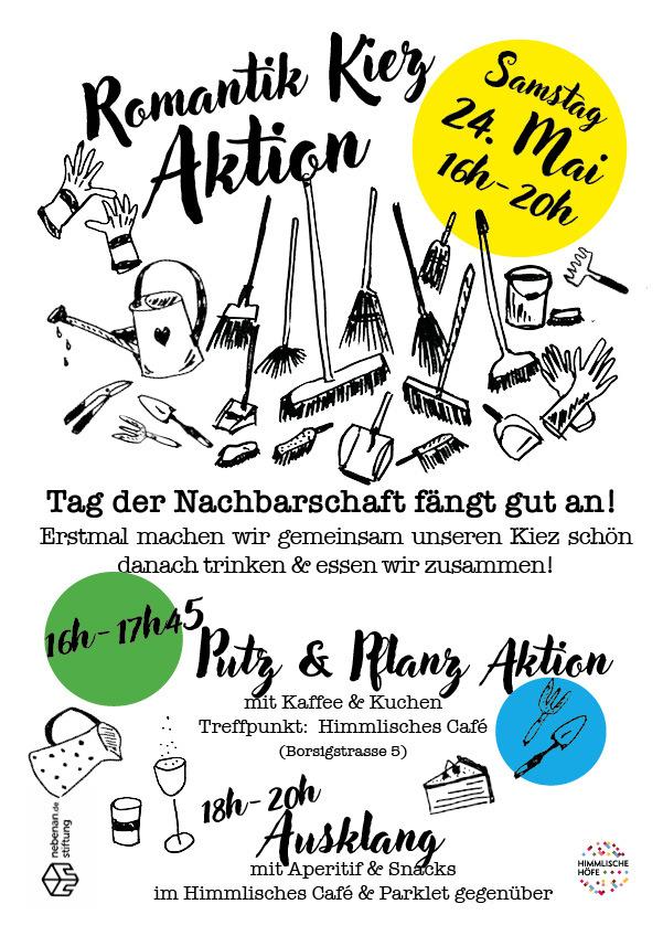 Am Tag der Nachbarschaft, Samstag, den 24. Mai, putzen wir erstmal von 16 Uhr bis 18 Uhr gemeinsam und danach feiern wir zusammen.