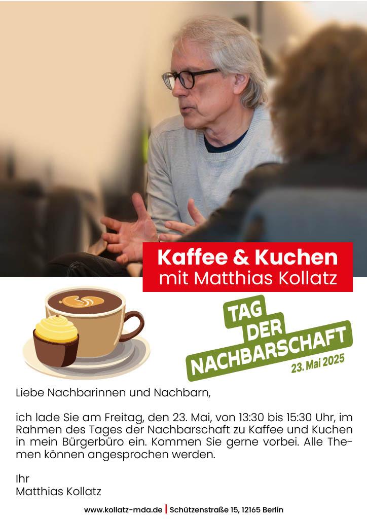 Anlässlich des Tags der Nachbarschaft lade ich Sie herzlich zu Kaffee und Kuchen in meinem Bürgerbüro in meinem Bürgerbüro in der Schützenstr. 15 ein.