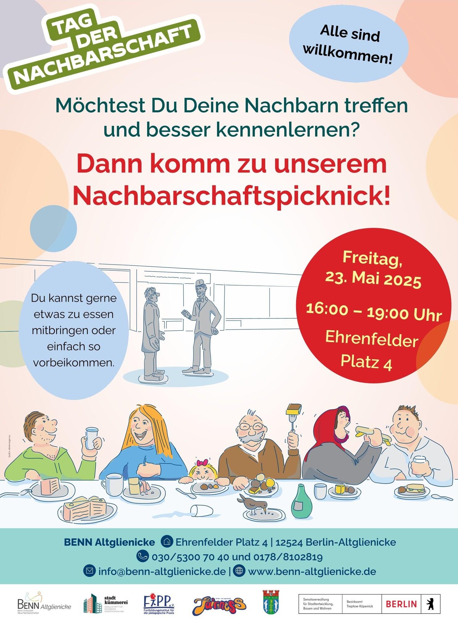 Das BENN Team läft herzlich ein zum Nachbarschaftspicknick auf dem Ehrenfelder Platz (an Tischen).