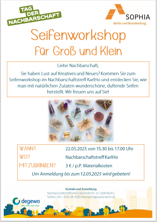 Liebe Nachbarschaft, Sie haben Lust auf Kreatives und Neues? Kommen Sie zum Seifenworkshop im Nachbarschaftstreff KarlHo und entdecken Sie, wie man mit natürlichen Zutaten wunderschöne, duftende Seifen herstellt. Wir freuen uns auf Sie!