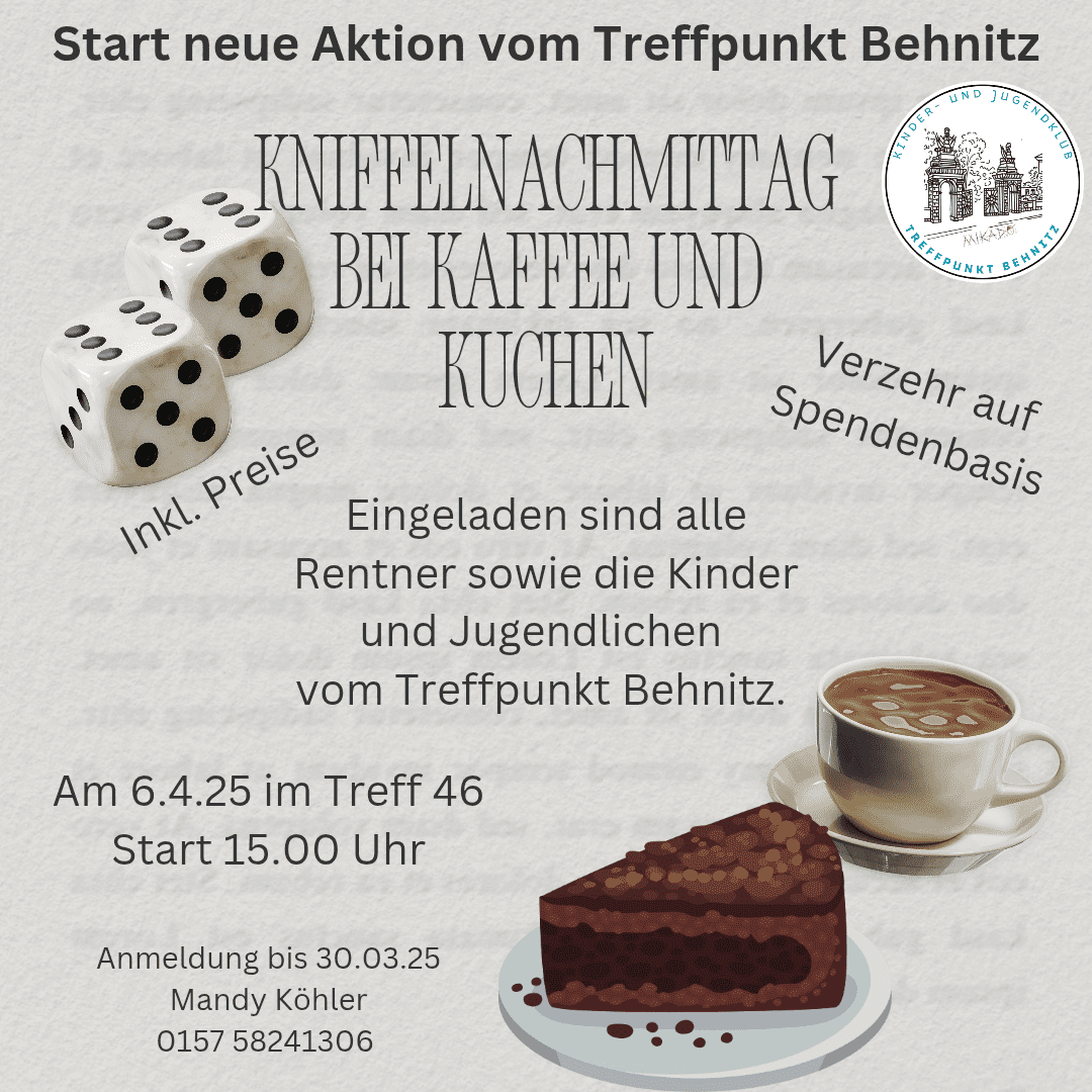 Wir sind ein Kinder- und Jungendklub in Groß Behnitz und möchten mehr mit den Rentnern machen. Bei dem Kniffelnachmittag möchten wir erreichen, dass die Kinder und die Rentner sich etwas kennenlernen und ihre Geschichten erfahren. Geplant ist, dass diese Nachmittage 1x im Monat stattfinden.