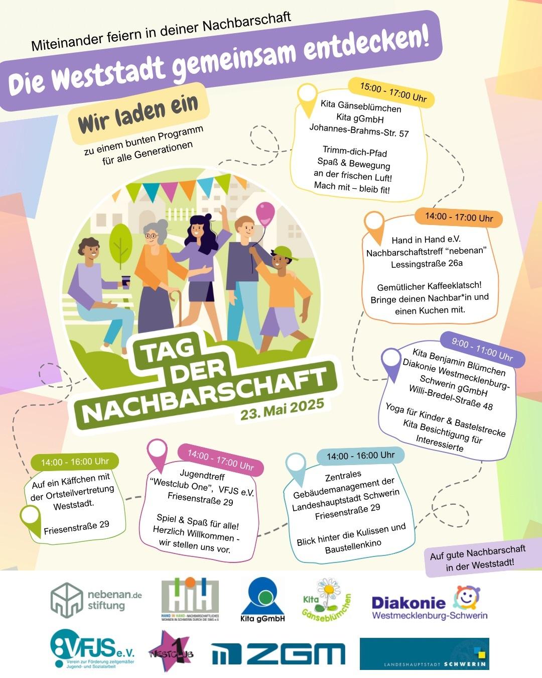 Bei unserer Aktion feiert der gesamte Stadtteil an verschiedenen Orten „Tag der Nachbarschaft“, unterschiedliche Einrichtungen laden zu sich und zu gemeinsamen Begegnungen ein.