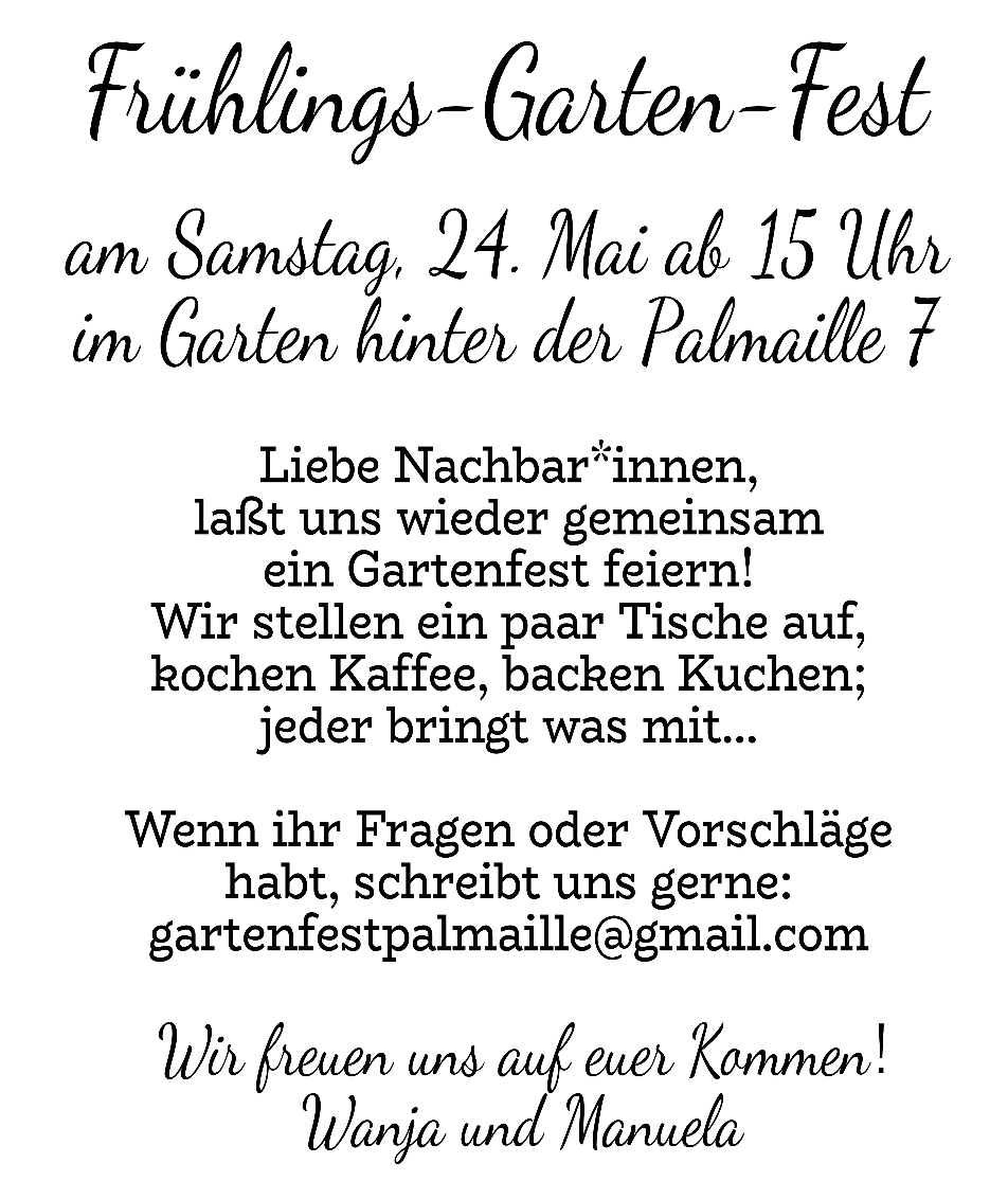 Wenn ihr Fragen oder Vorschläge habt, schreibt uns gerne: gartenfestpalmaille@gmail.com