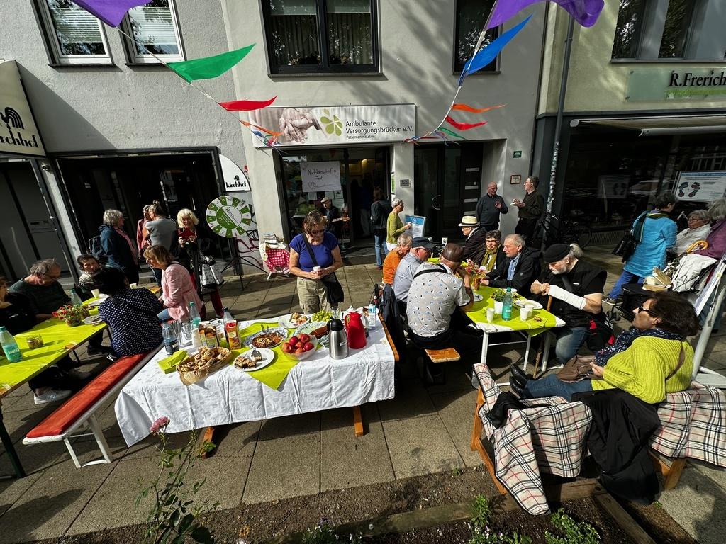 Nachbarschaftsfest mit 2 kleinen Zelten, Bänken und Tischen auf dem sehr breiten Gehweg vor dem Büro, öffentlich zugängig