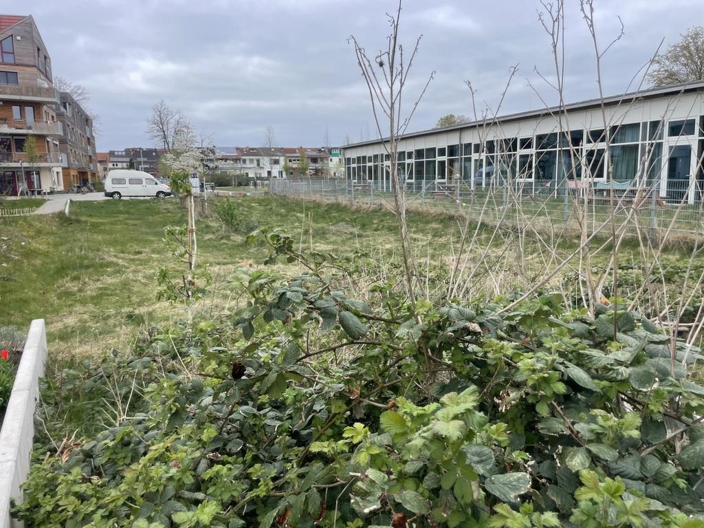 Früher gab es unweit dieser Wiese ein kleines Wäldchen, was bei der Dioxinsanierung und Umgestaltung des alten Sportplatzes durch die Rand-Bebauung gefällt wurde. Auf dieser Wiese Bäume, Büsche und Stauden zu pflanzen bietet sich als eine Art „Wiedergutmachung“ an. Und die Pflanzen binden CO2, kühlen die Umgebung durch Verdunstung und tragen zum Wasserrückhalt (Stichwort: Schwammstadt Bremen) mit bei. Denn: mittlerweile sind die Sommer so heiß, dass man sich doch über ein schattiges Plätzchen im Grünen freut. Auf der angrenzenden Waller Mitte fehlen total die Schatzenplätze. Also, lasst uns gemeinsam mehr Aufenthaltsqualität schaffen!