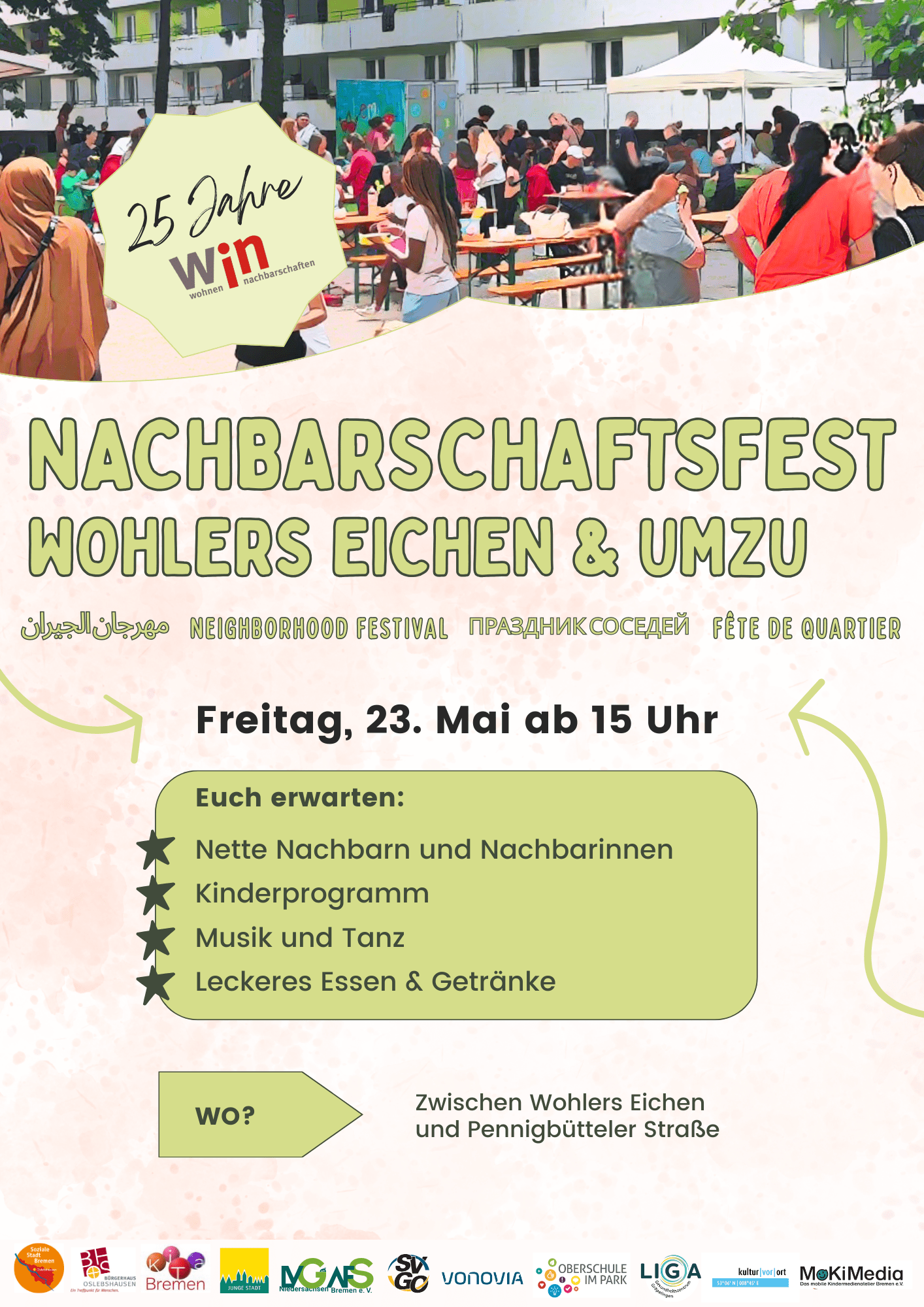 Am 23. Mai 2025 feiern wir ein Fest in Oslebshausen. Das Programm „Wohnen in Nachbarschaften“ (WiN) in Bremen wird 25 Jahre alt. Wir wollen dieses Jubiläum am Tag der Nachbarschaft feiern.