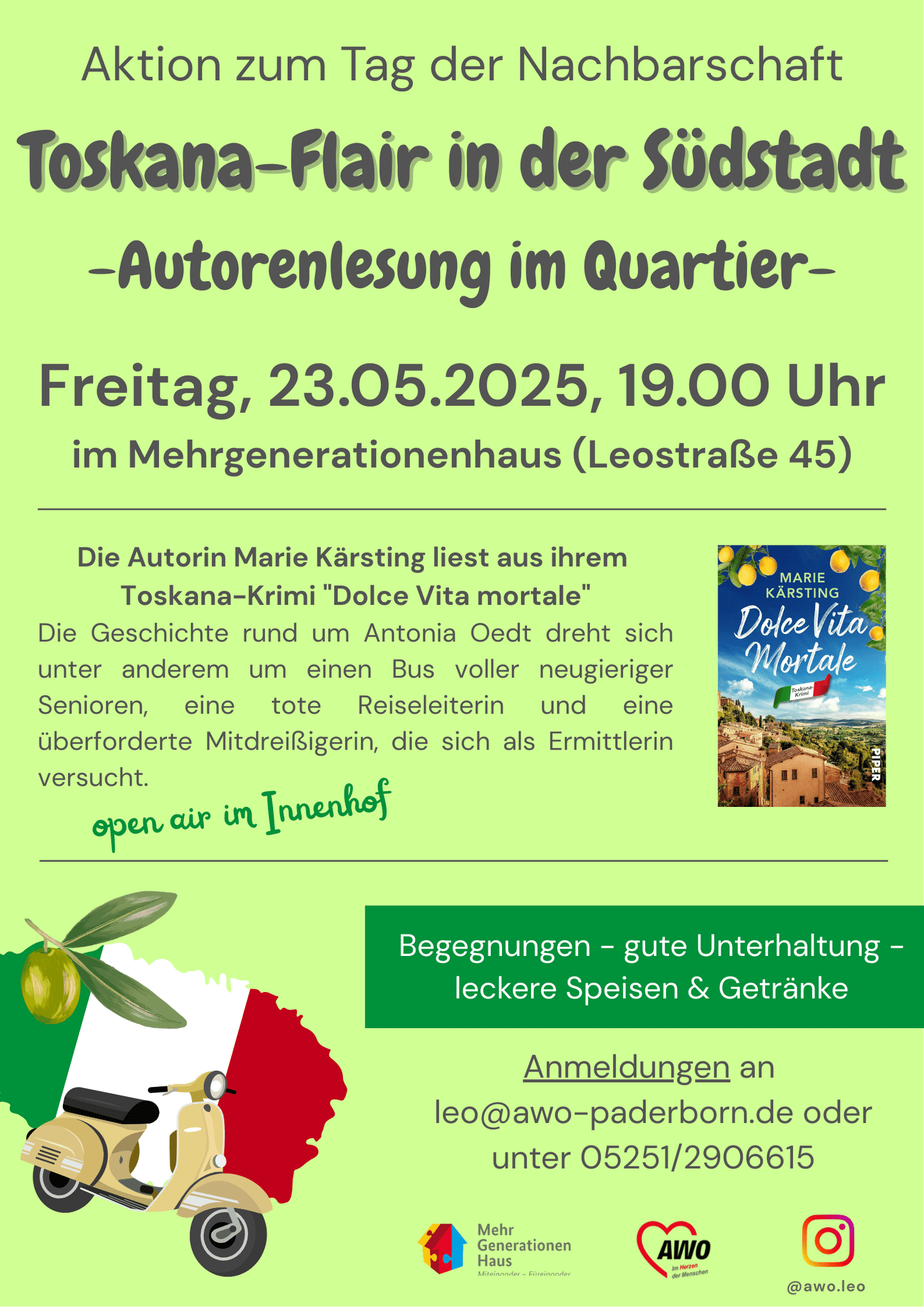 Am Freitag, den 23.05.2025 ist ab 19.00 Uhr die Autorin Marie Kärsting zu Gast und liest aus ihrem Toskana-Krimi "Dolce Vita Mortale". Bei gutem Wetter findet die Veranstaltung open air im Innenhof statt und verbreitet Urlaubsgefühle im Italien-Flair.