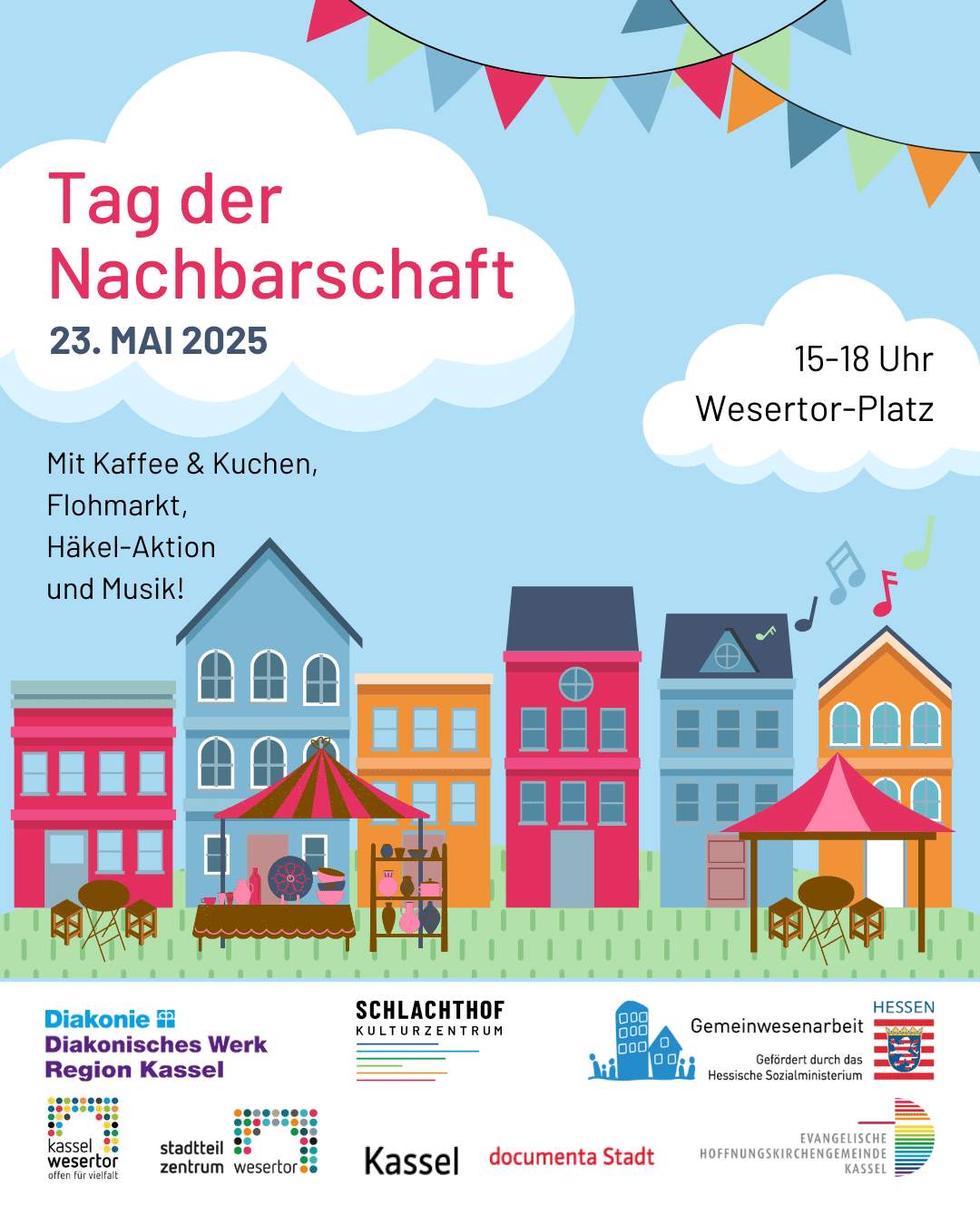 Gemeinsam mit der Gemeinwesenarbeit Wesertor der Kulturzentrum Schlachthof gGmBH, dem Stadtteilzentrum Wesertor, dem Projekt "hier im Quartier" der Kulturzentrum Schlachthof gGmbH, der Stadt Kassel und der evangelischen Hoffnungskirchengemeinde lädt das Diakonische Werk Region Kassel am 23.05.25 zum Tag der Nachbarschaft auf den Wesertorplatz ein. Es gibt ein buntes Programm von Flohmarkt, über eine gemeinsame Häkel-Aktion zu Kaffee und Kuchen und kennenlernen untereinander.