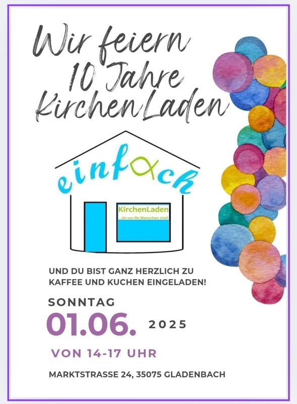 Zum Tag der Nachbarn feiern wir gemeinsam mit Nachbarn und Freunden des KirchenLadens Gladenbach unser 10-jähriges Bestehen. Freut Euch auf ein Nachmittag mit guten Impulsen, Kaffee und Kuchen, guter Musik, nette Gespräche und auf Begegnung mit neuen und alten Freunden. Der KirchenLaden Gladenbach ist ein christlicher Begegnungstreff, der für alle Menschen, egal welche Religion, Herkunft und gesellschaftlichen Stand ein friedlicher Ort der Begegnung ist.