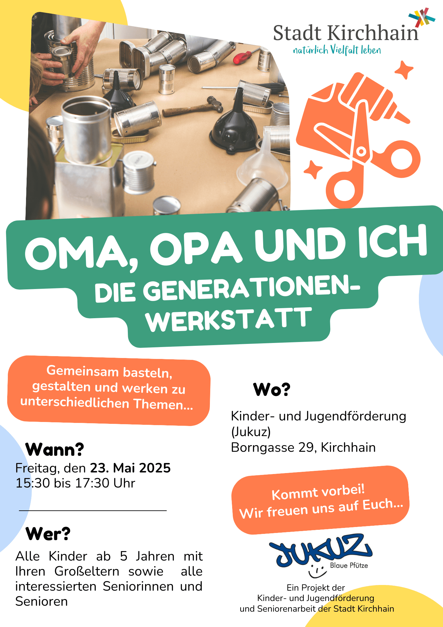 Wir die Kinder- und Jugendförderung der Stadt Kirchhain laden euch herzlichst zu unserer Aktion „Oma, Opa und Ich - Die Generationenwerkstatt“ ein.