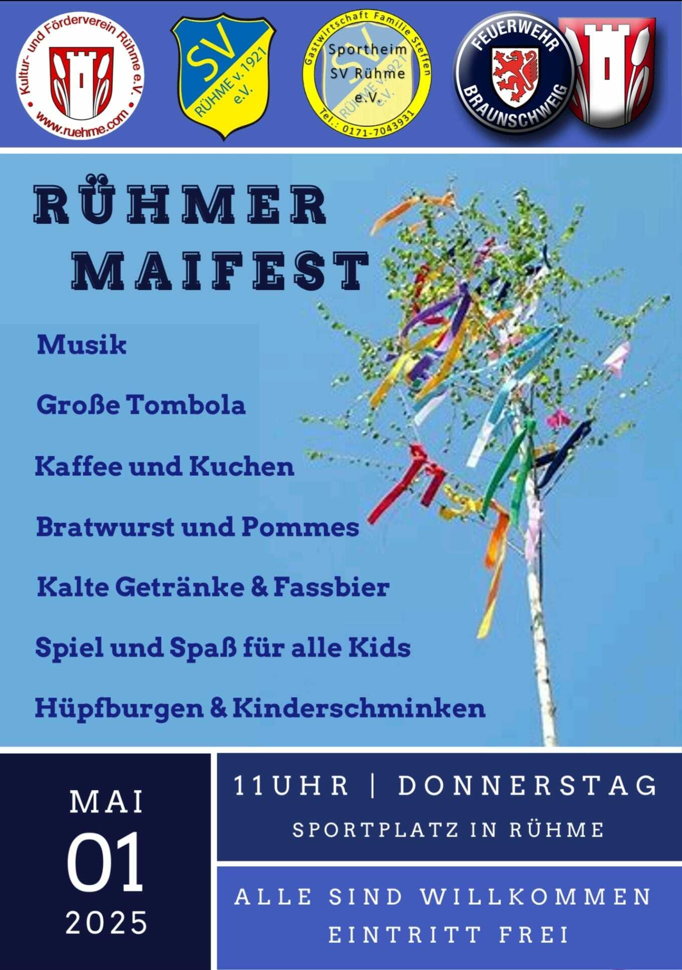 Am 1. Mai ab 11:00 Uhr laden wir euch herzlich zum 1. Maifest in Rühme ein! Auf dem Sportplatz in Rühme kommen die Rühmer Vereine zusammen und stellen sich vor – eine perfekte Gelegenheit, die Gemeinschaft kennenzulernen und einen tollen Tag zu verbringen.