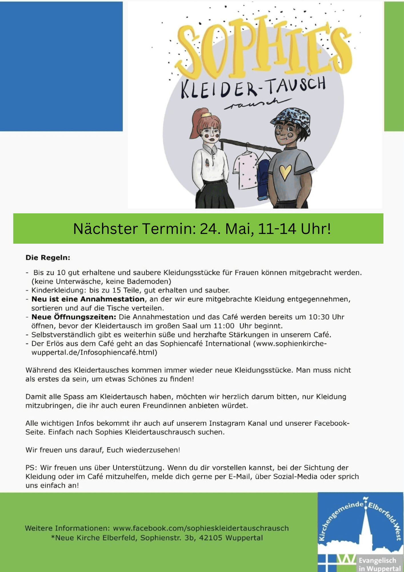 Lust auf was Neues im Kleiderschrank? Aber nachhaltig soll es sein? Bringt bis zu 10 ausgeliebte, gewaschene Kleidungsstücke (keine Unterwäsche, keine defekte Kleidung) mit und sucht euch etwas aus, was andere Frauen ausrangiert haben. Zwischendurch könnt ihr euch bei einer Waffel oder Falafel stärken. Der Erlös geht an unser Sophiencafé International. Der Kleidertausch ist kostenlos.