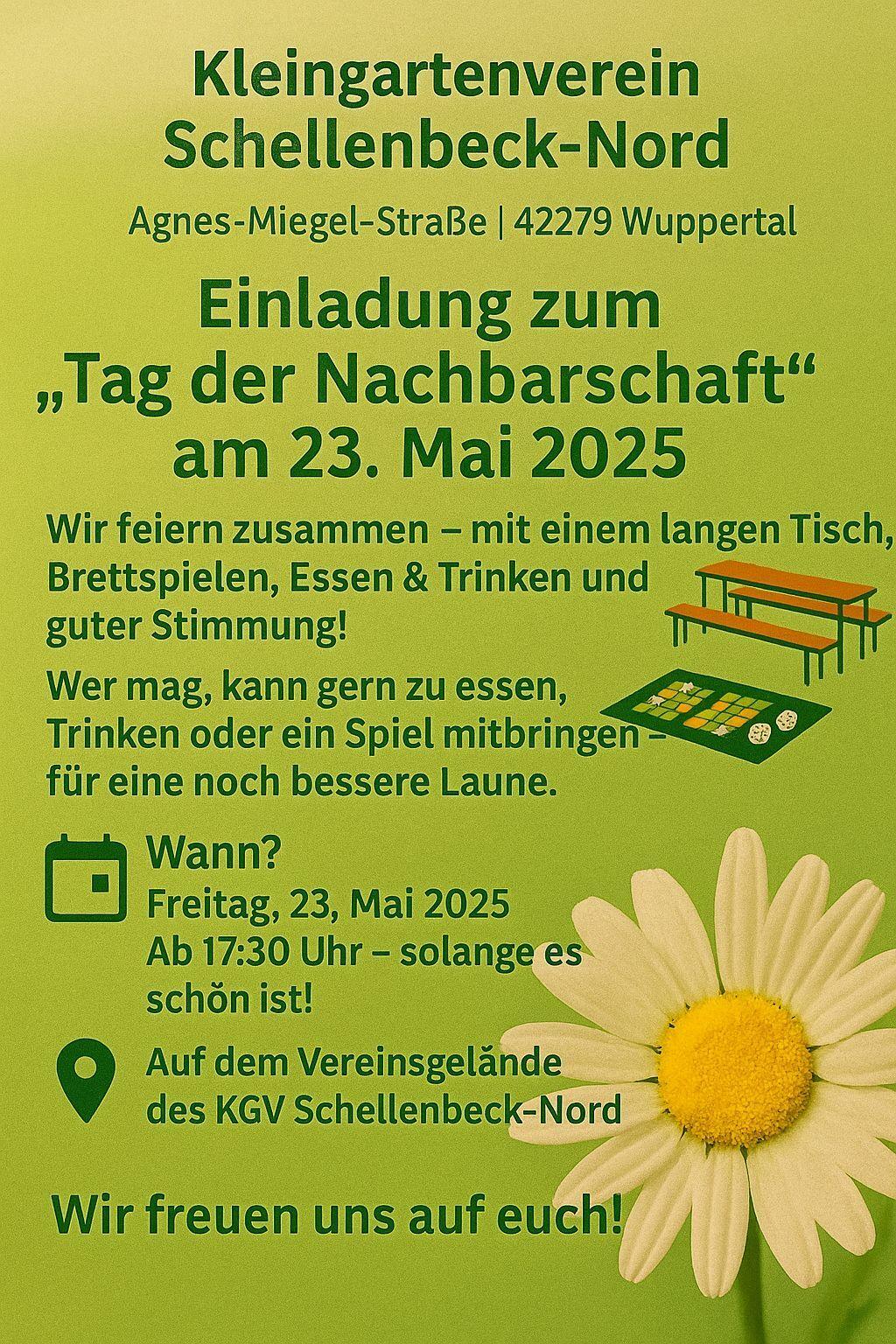 Wir der KGV Schellenbeck-Nord e.V. feiern zusammen den Tag der Nachbarschaft mit einem langen Tisch mit Brettspiele, Essen und Trinken und Guter Laune.