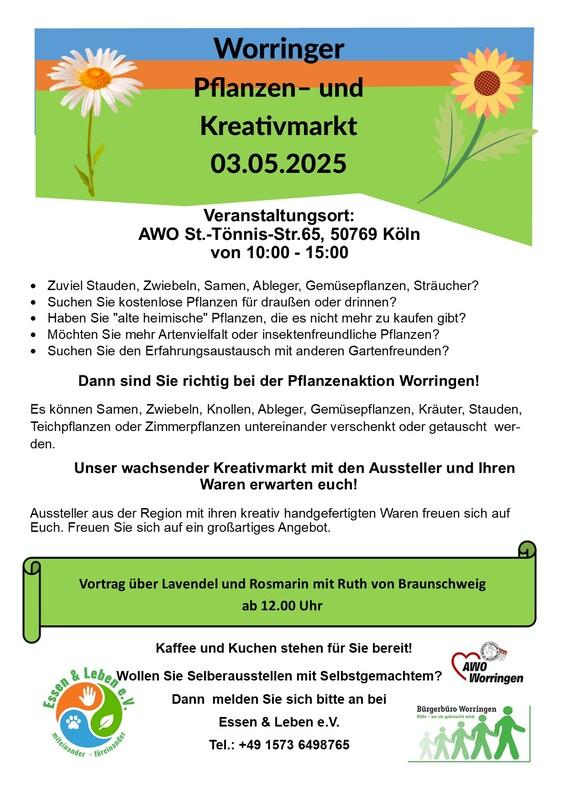 An diesem Tage lädt der Verein Essen & Leben e.V. zu einer Pflanzenverschenkbörse ein. Hier trifft sich die Nachbarschaft Worringens um über Gärten, Pflanzen. Bäume etc. zu diskutieren. In diesem Rahmen ist ein Kreativmarkt entstanden wo regionale Stände selbstgemachtes und selbstgebasteltes anbieten.