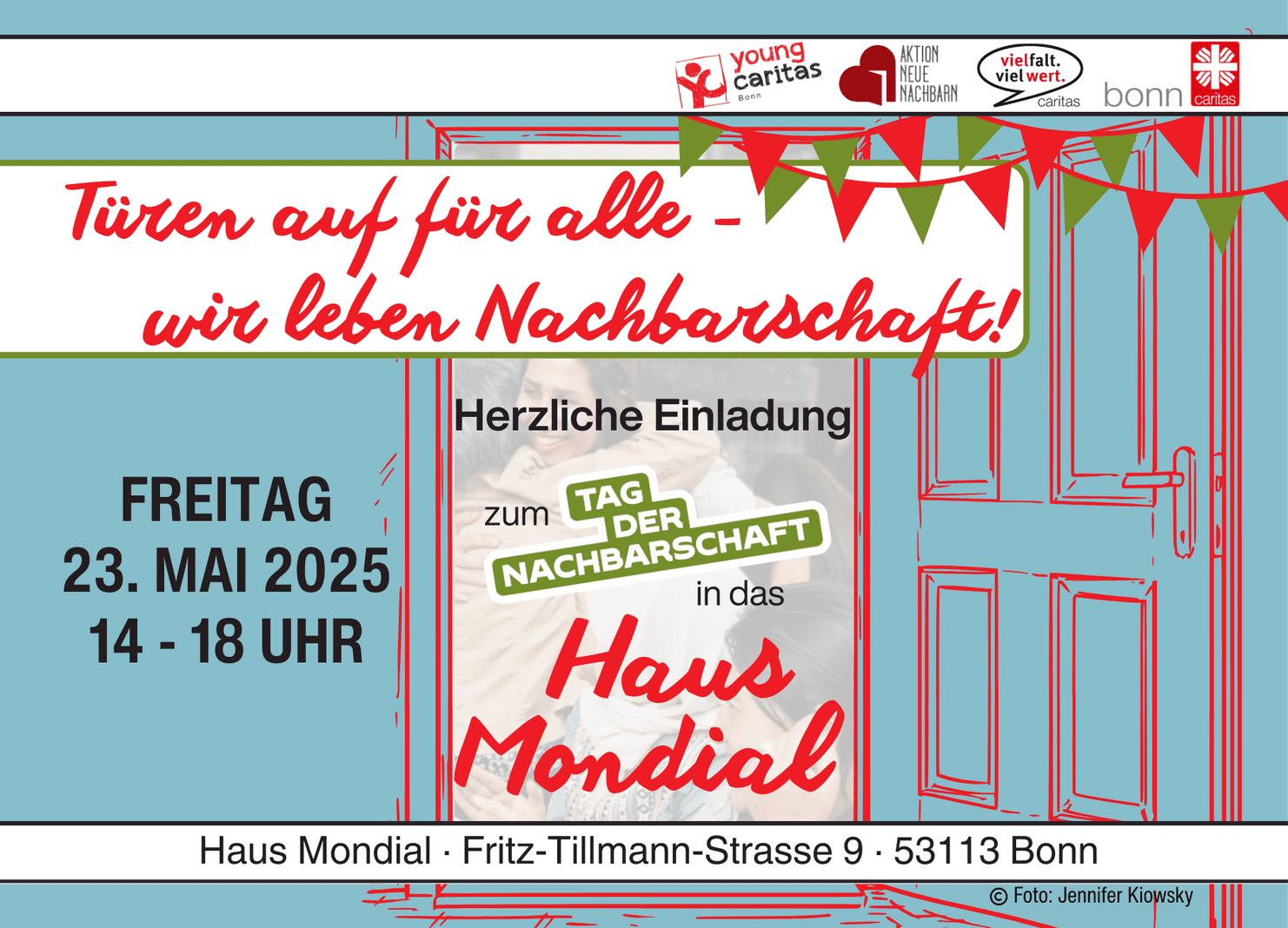Wir, die Caritas Bonn (youngcaritas, Kampagne vielfalt. viel wert., Aktion Neue Nachbarn, Gemeindecaritas), öffnen unsere Türen und laden Euch ein in das Haus Mondial. Der Zugang zum Gebäude ist leider nicht barrierefrei. Es gibt keine barrierefreie Toilette. Bei gutem Wetter werden wir auch den Hinterhof nutzen, der mit einem Rollstuhl befahrbar ist.