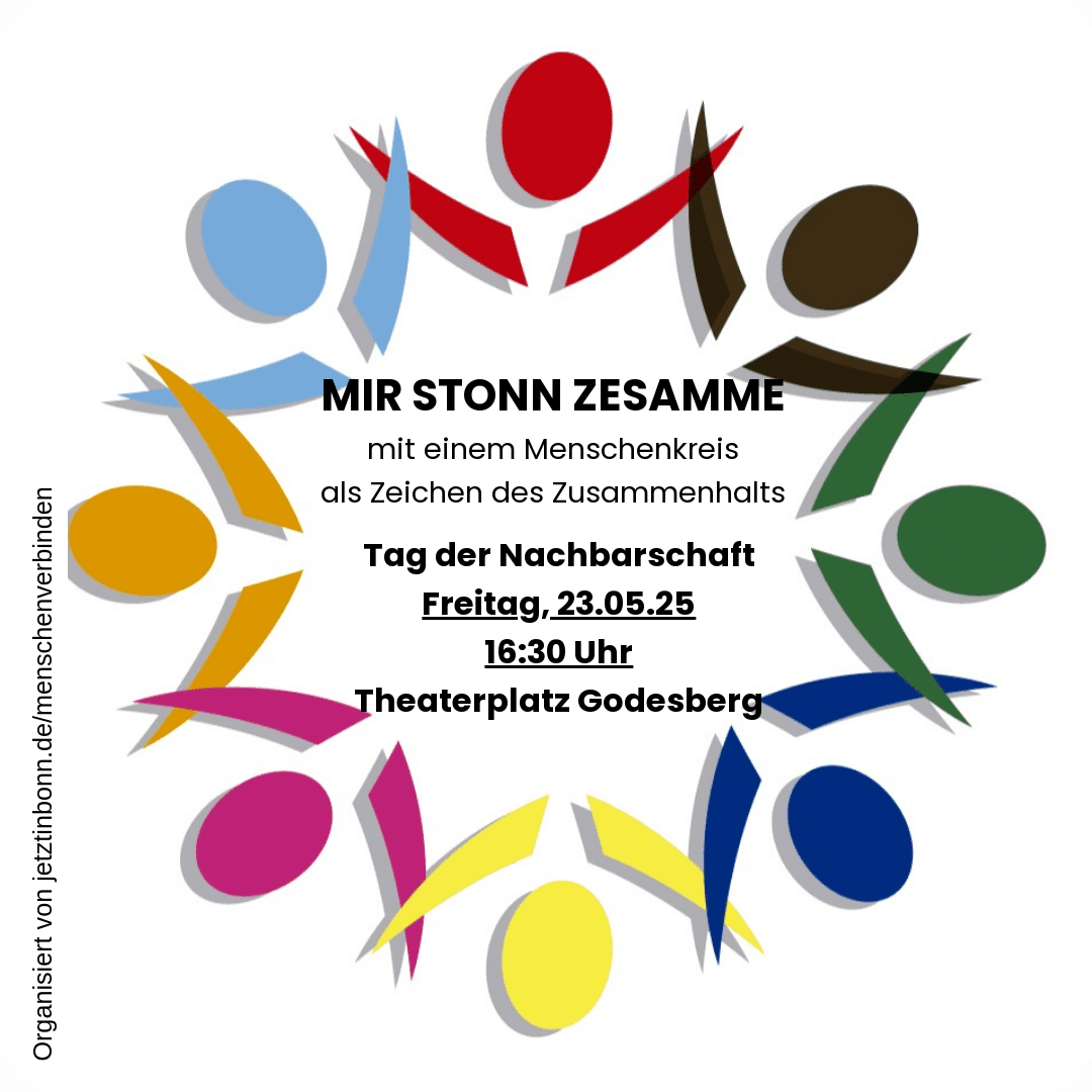 Um im Kreis der Nachbarschaft Vielfalt und Solidarität sichtbar zu machen, sind alle, die sich angesprochen fühlen, eingeladen, auf dem Theaterplatz unter freiem Himmel in Bad Godesberg zusammenzukommen.