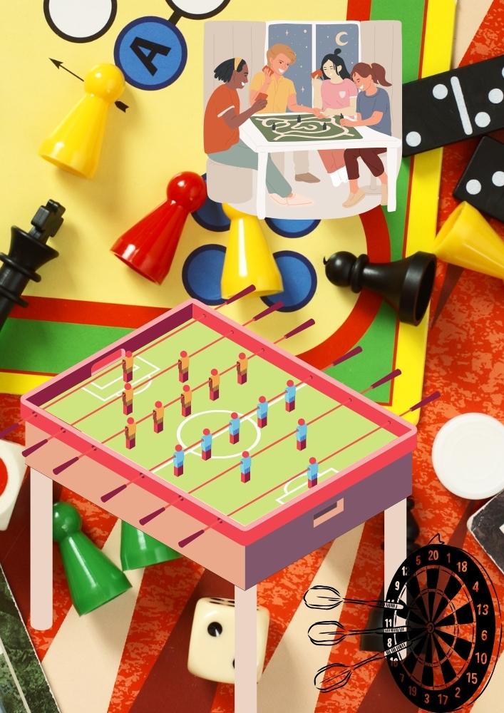 Es erwarten euch spannende Brett- und Kartenspiele für Groß und Klein. Außerdem stehen ein Kicker und eine Dartscheibe bereit – hier ist für jeden etwas dabei!