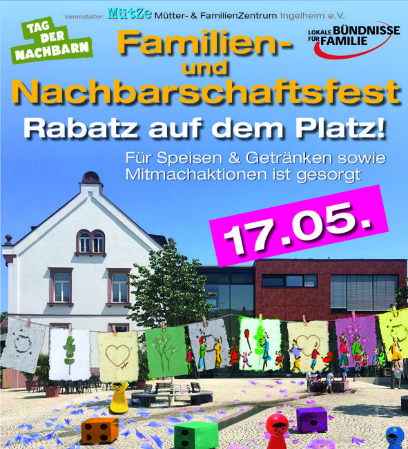 Am 17. Mai feiern wir nachmittags von 14 bis 18 Uhr auf dem Vorplatz des Mütter- und FamilienZentrums Ingelheim e.V. mit Nachbarn, Familien und Freunden ein kleines Fest in lockerer Atmosphäre. Und gutes Wetter soll´s auch gewben 🙂