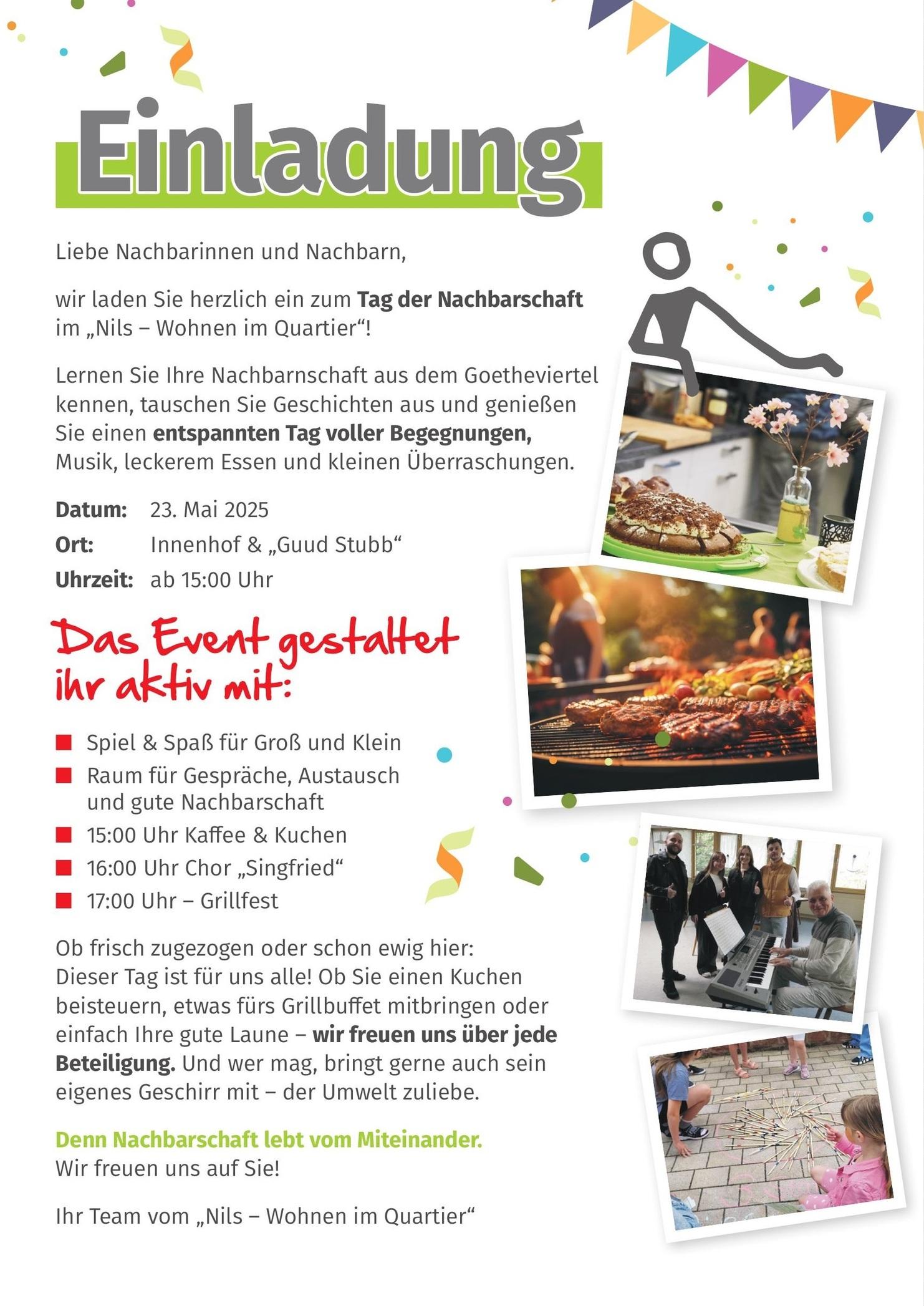 wir laden Sie herzlich ein zum Tag der Nachbarschaft im „NILS – Wohnen im Quartier“ Goetheviertel!