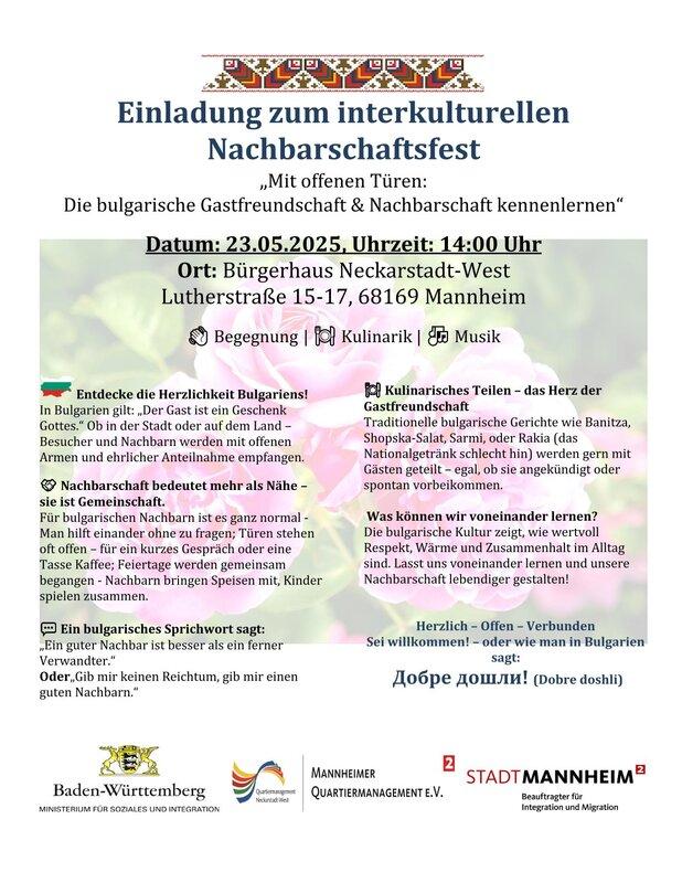 Es findet am Freitag, 23.05.2025 ab 14 Uhr vor dem Bürgerhaus Neckarstadt-West, Lutherstraße 15-17, 68169 Mannheim statt.