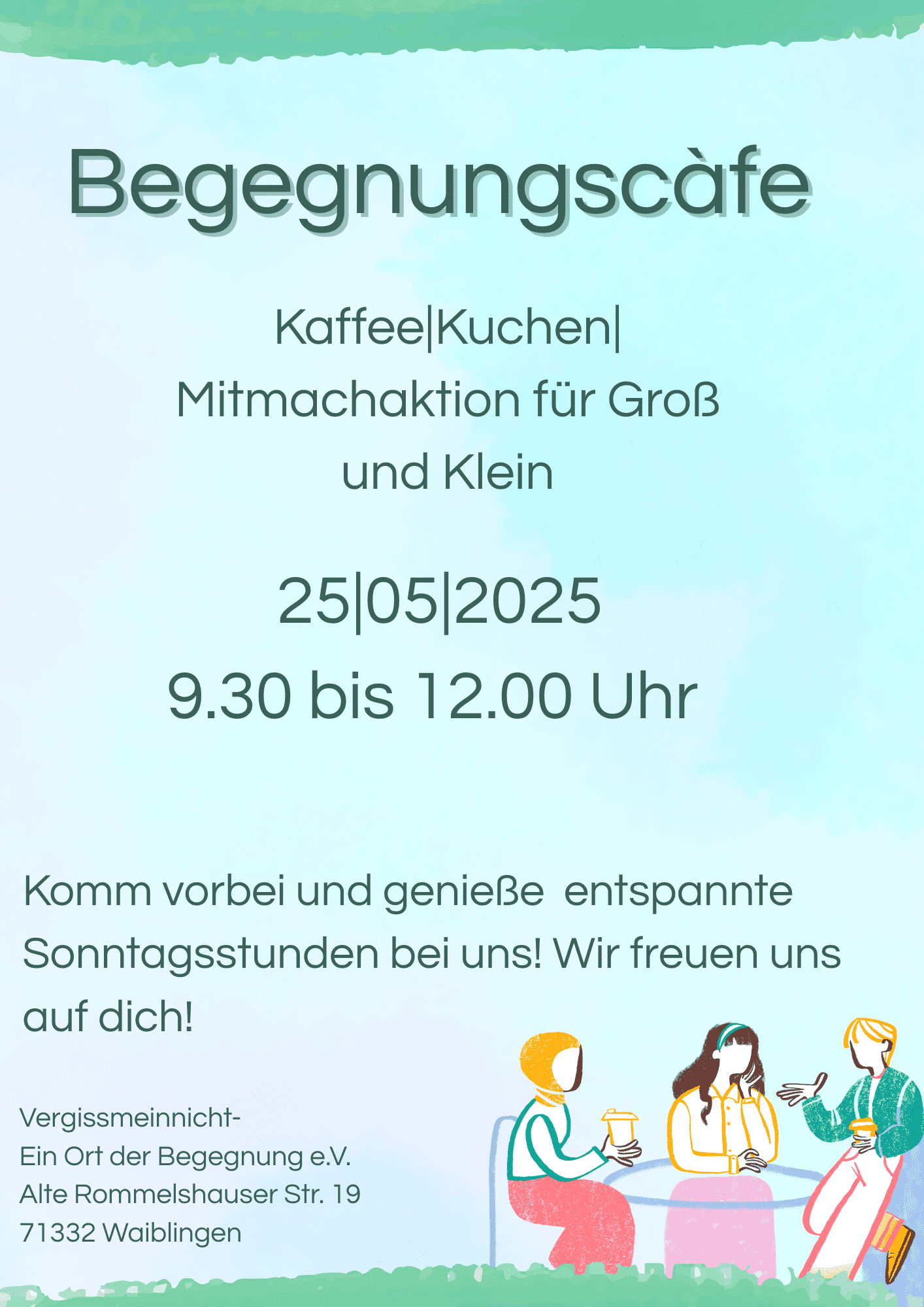 Der Verein Vergissmeinnicht - Ein Ort der Begegnung e.V. lädt dich herzlich ein, am 25.05. von 9:30 bis 12:00 Uhr unseren Begegnungstreff zu besuchen. Freu dich auf leckeren Kaffee, selbstgebackenen Kuchen und eine entspannte Atmosphäre, die zum Verweilen einlädt.