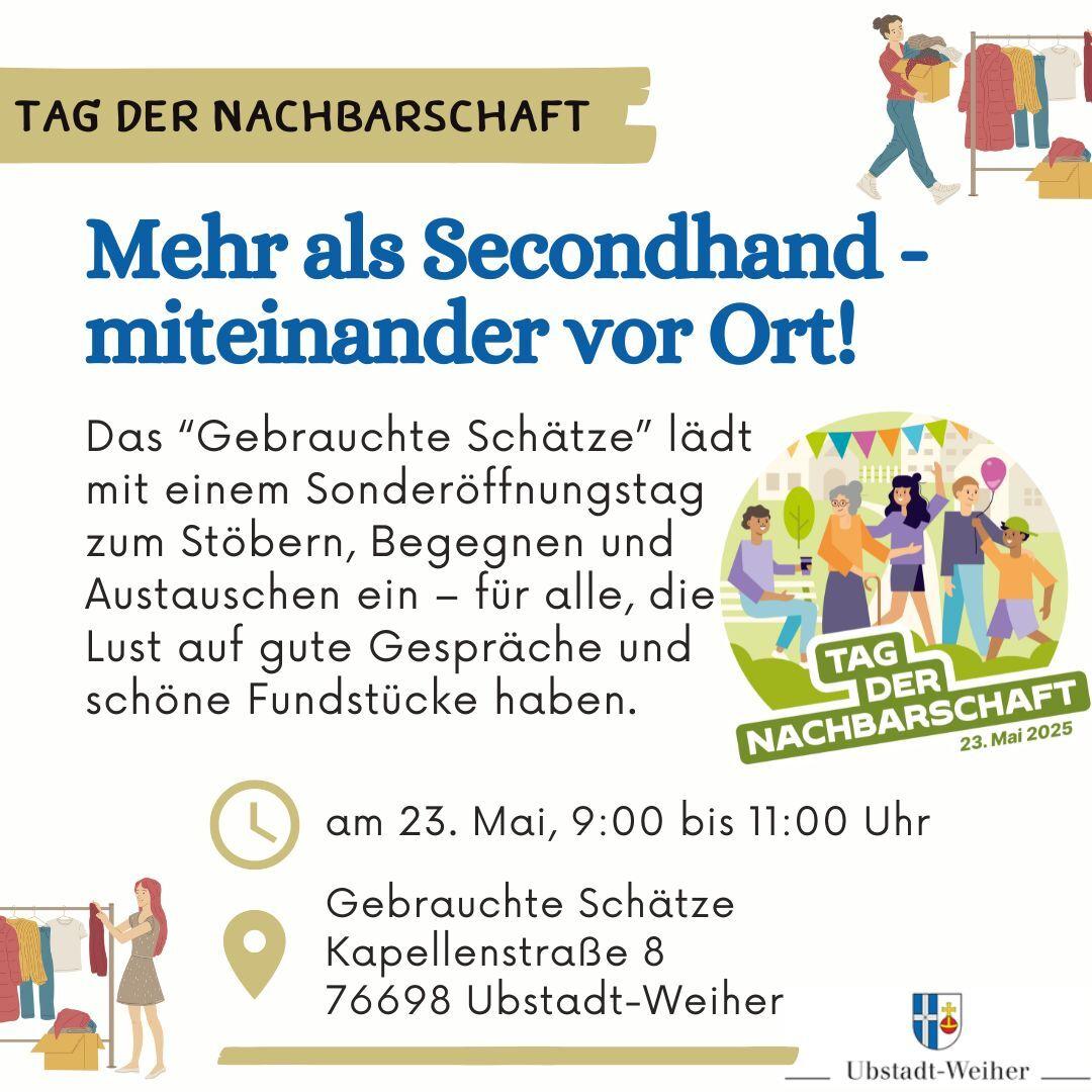 Der Secondhand-Laden "Gebrauchte Schätze" lädt am Tag der Nachbarschaft herzlich ein: Unter dem Titel „Mehr als Secondhand – miteinander vor Ort“ öffnen sich an diesem Tag von 9 bis 11 Uhr die Türen. Neben einer feinen Auswahl an Kleidung, Deko und allerlei kleinen Fundstücken bietet sich die Gelegenheit, ins Gespräch zu kommen, neue Gesichter aus der Nachbarschaft und der Gemeinde kennenzulernen und ein Stück gelebter Gemeinschaft zu erleben.