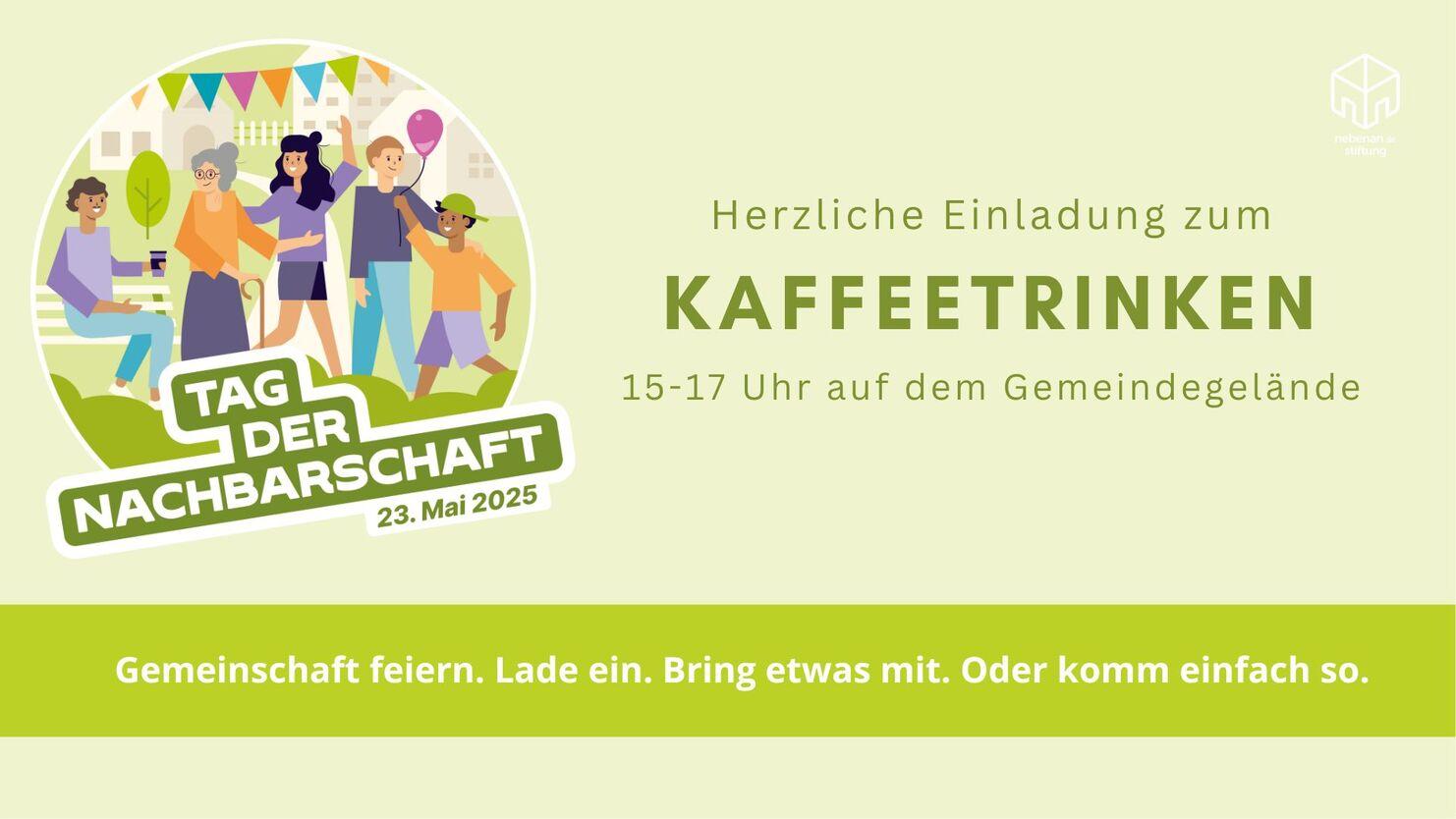 Liebe Nachbarschaft! Zum Tag der Nachbarn am 31.5. laden wir euch wieder zu einem geselligen Kaffeetrinken zwischen 15 und 17 Uhr ein. Kaffee, Tee und Kuchen sind vorhanden, ihr dürft aber auch gern etwas beisteuern und mitbringen. Für Kinder gibt es Spielgeräte und Platz im Garten zum Spielen.