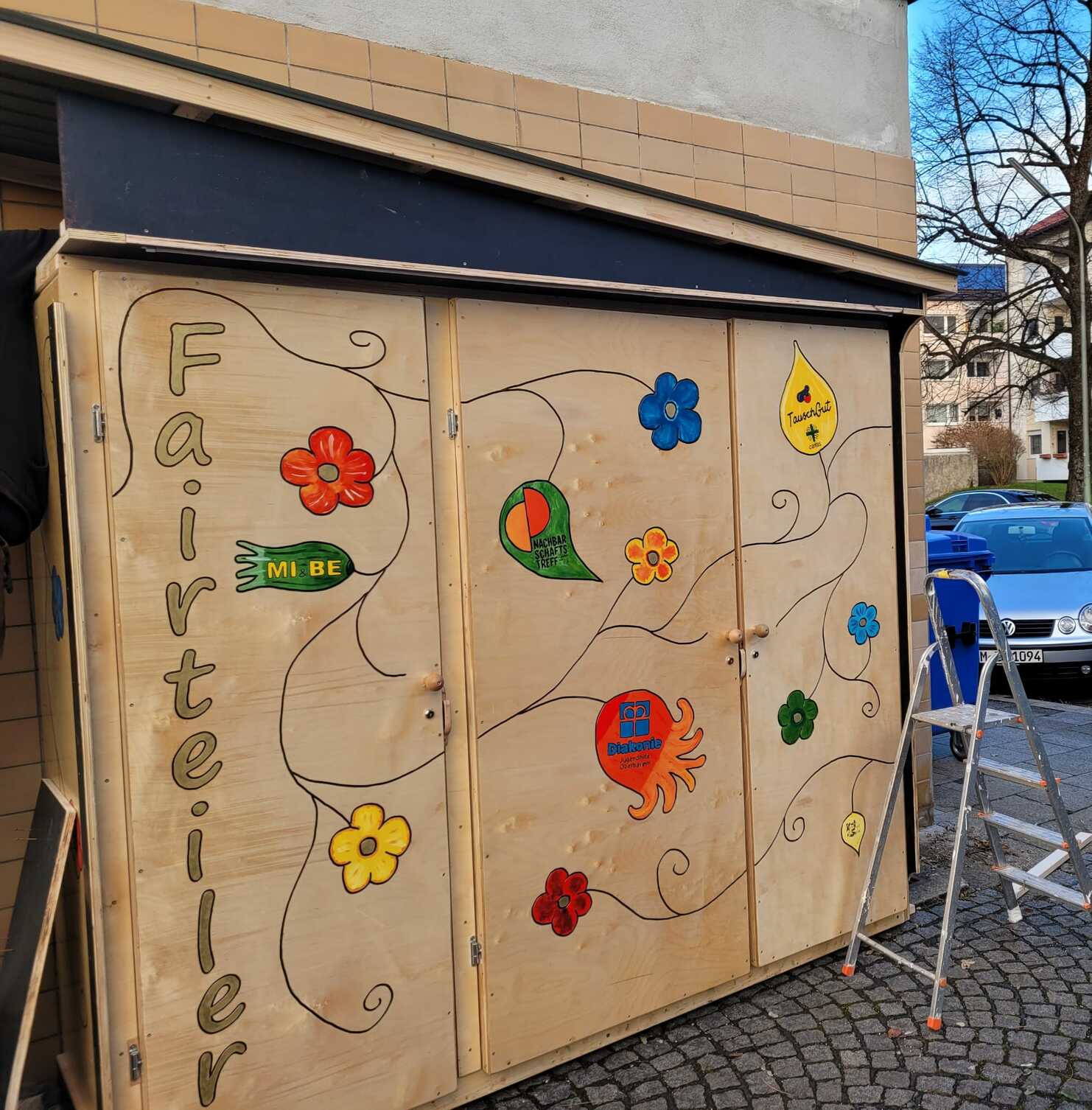 links vom Sozialkaufhaus Mi + Be steht unser neuer FairTeiler, ein Kühlschrank und Regal, in dem Lebensmittel gerettet werden vor der Tonne. Jede(r) kann ohne Nachweis von Bedürftigkeit sich bedienen und auch übrige Lebensmittel dort einlegen.