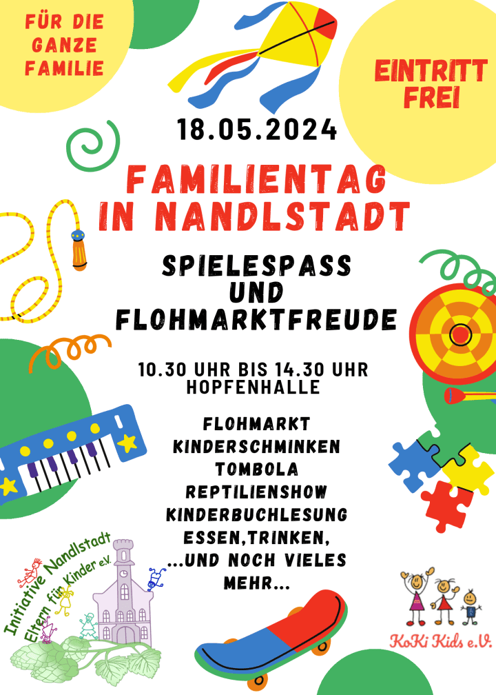Die Initiative Nandlstadt Eltern für Kinder lädt alle herzlich zu unserem Familientag ein. Es gibt viel zu erleben: ein Flohmarkt für alle, zahlreiche Spielstationen, Buchlesungen, Märchenerzähler, Seifenblasen, Kinderschminken und vieles mehr.Der Beginn ist um 10:30, das Ende um 14:30.