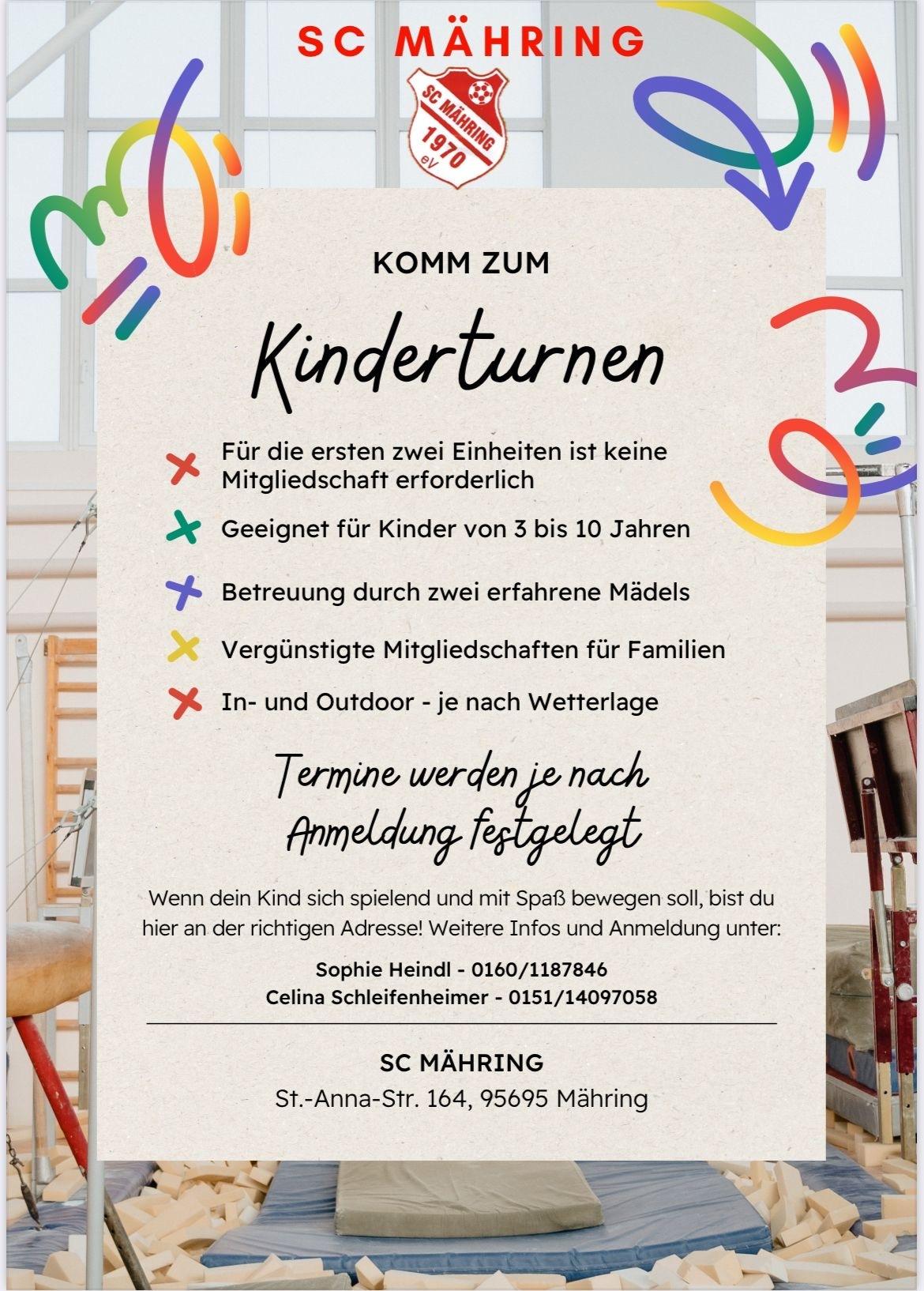 Wir der SC Mähring laden am 09.05.2025 zum Beginn der Kinderturnserie alle Eltern oder Angehörige ein um während der Veranstaltung bei Kaffe und Kuchen das treiben zu beobachten.